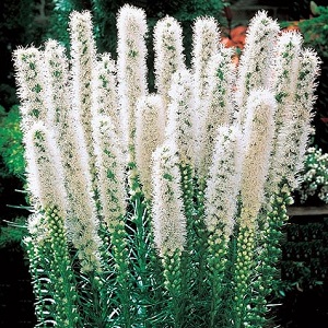 Liatris ‘Floristan White’ has attractive tall spikes of white flowers in summer, from July to September. Plants grow to a height of 75-90cm and are good for borders and containers. They attract butterflies into the garden, and are popular cut and dried flowers.